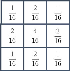 ガウス平滑化の場合には中心の重みが大きく、そこから遠ざかるほど、重みが小さくなっていきます。