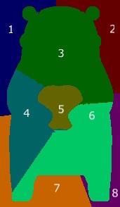 実際には上記のようにある程度細かく領域を分けますが、以下では例として扱いやすいように次のような画像を考えて、粗く領域を分けていきます(左がオリジナルのくまモンで、右がsuperpixelに分割されたくまモンです)。