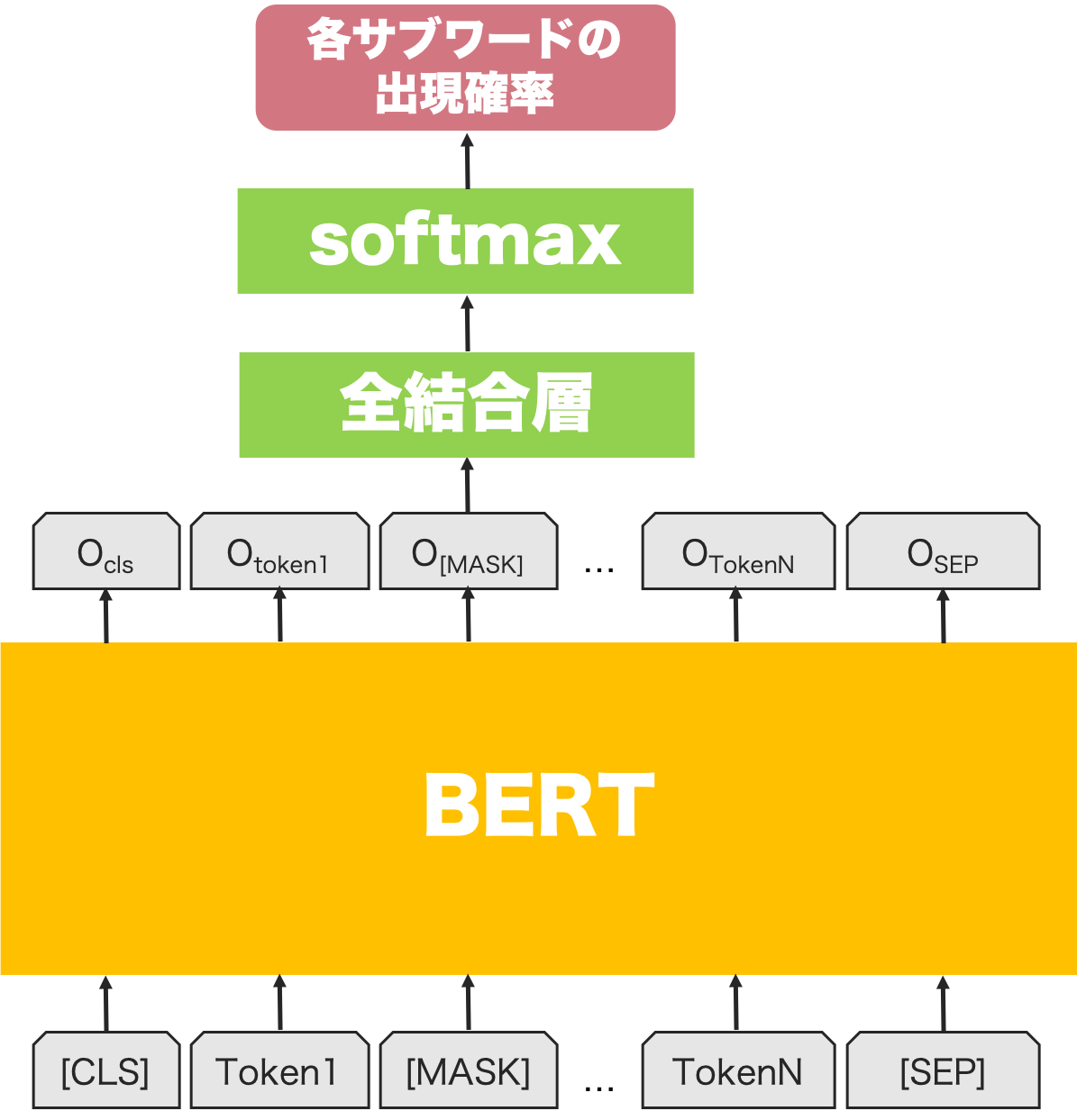 - BERTの出力のうち、[MASK]に対応するトークンの出力${\rm O_{[MASK]}}$に対して全結合層とsoftmaxを適用する(softmaxの結果が全サブワードの出現確率になります)。
