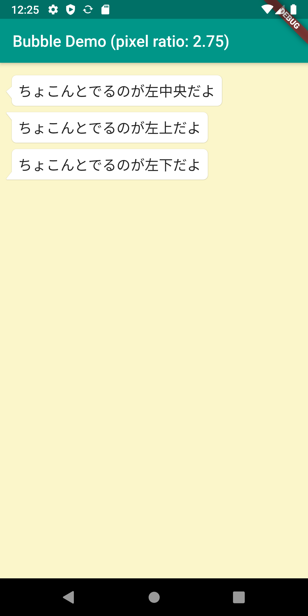 Flutterで吹き出しを出すためのライブラリとしてBubbleがあります。こちらを使うと吹き出しを簡単に表示できます。 もう一つSpeechBubbleというライブラリもありますが、Bubbleのほうが色々オプションが設定できます。