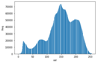 - channelsには画像のチャネルのうち、どれを用いてヒストグラムを計算するかを指定します。いまはグレースケールで1チャネルしかないため、0を指定しています。カラー画像のときにはBGRの3チャネルなので、channelに対応する0~2のどれかを指定します。